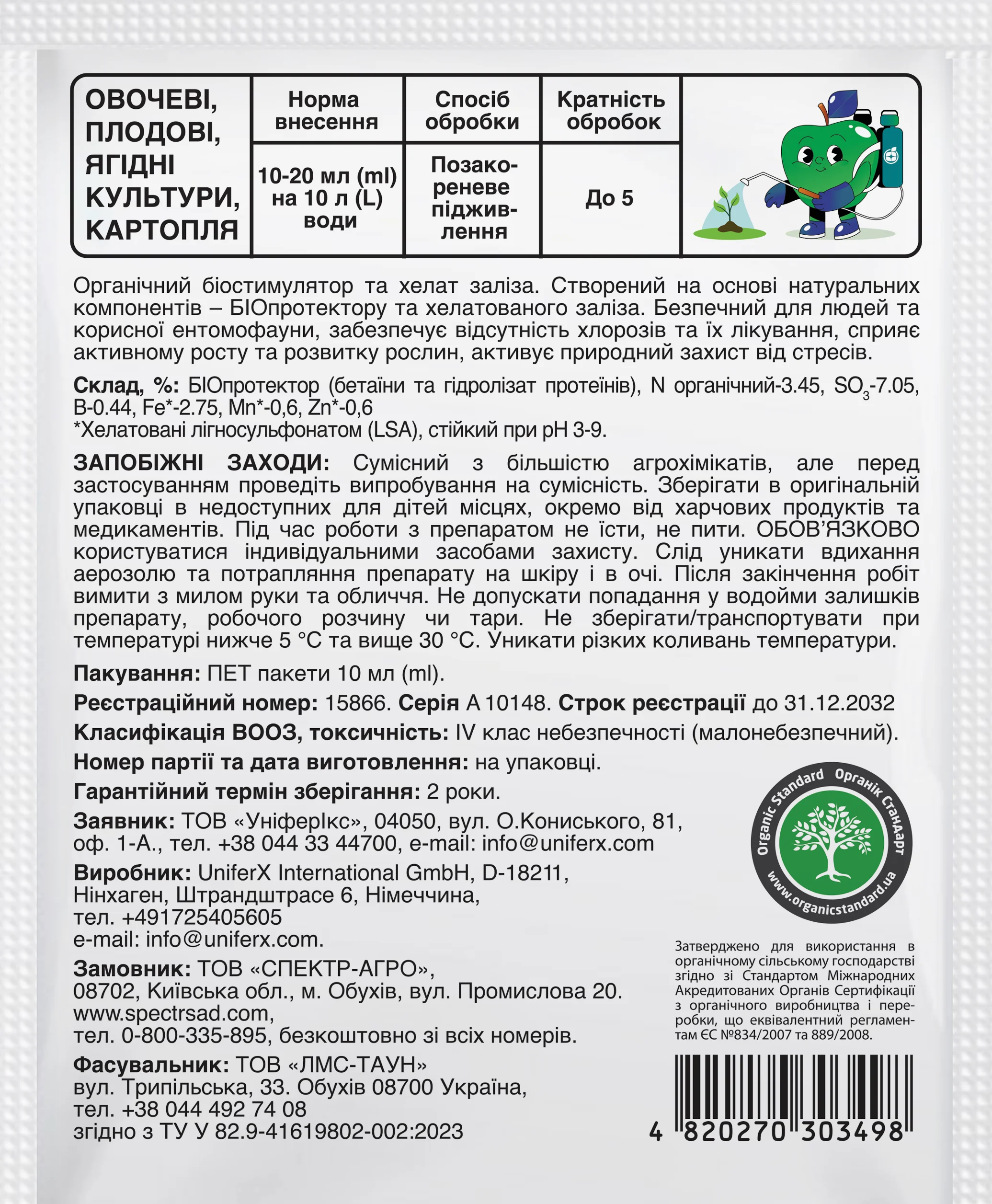 | Плодові, овочеві, картопля, декоративні, квіти | До 5 | Протягом вегетаційного періоду та при появі ознак хлорозу | 10-20 мл на 10 л води |