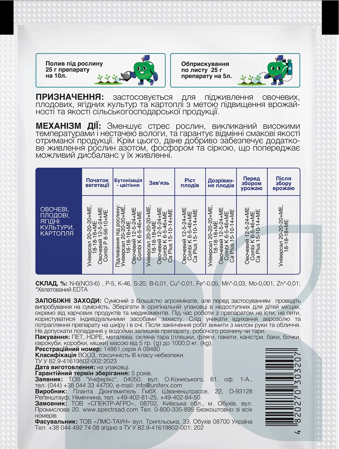 • Широкий спектр застосування: Підходить для підживлення овочів, фруктів, ягід, квітів, декоративних культур та картоплі.