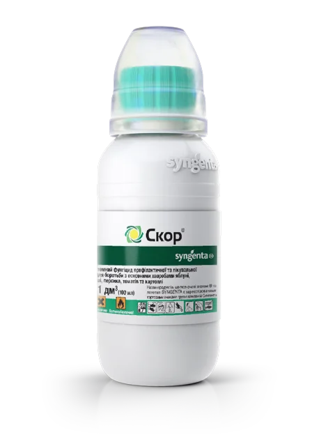 Скор® — неперевершений системний препарат для захисту плодових культур (яблуні й груші) від парші, а також персика від кучерявості листя. Препарат має надзвичайно сильну лікувальну (5 діб) і профілактичну (8–10 діб) дію проти збудників хвороб.