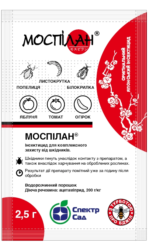 МОСПІЛАН – системний інсектицид контактно-шлункової дії проти представників родини: лускокрилих — Lepidoptera, напівтвердокрилих — Hemiptera, трипсів — Thysanoptera, твердокрилих — Coleoptera та рівнокрилих – Hоmоptera.