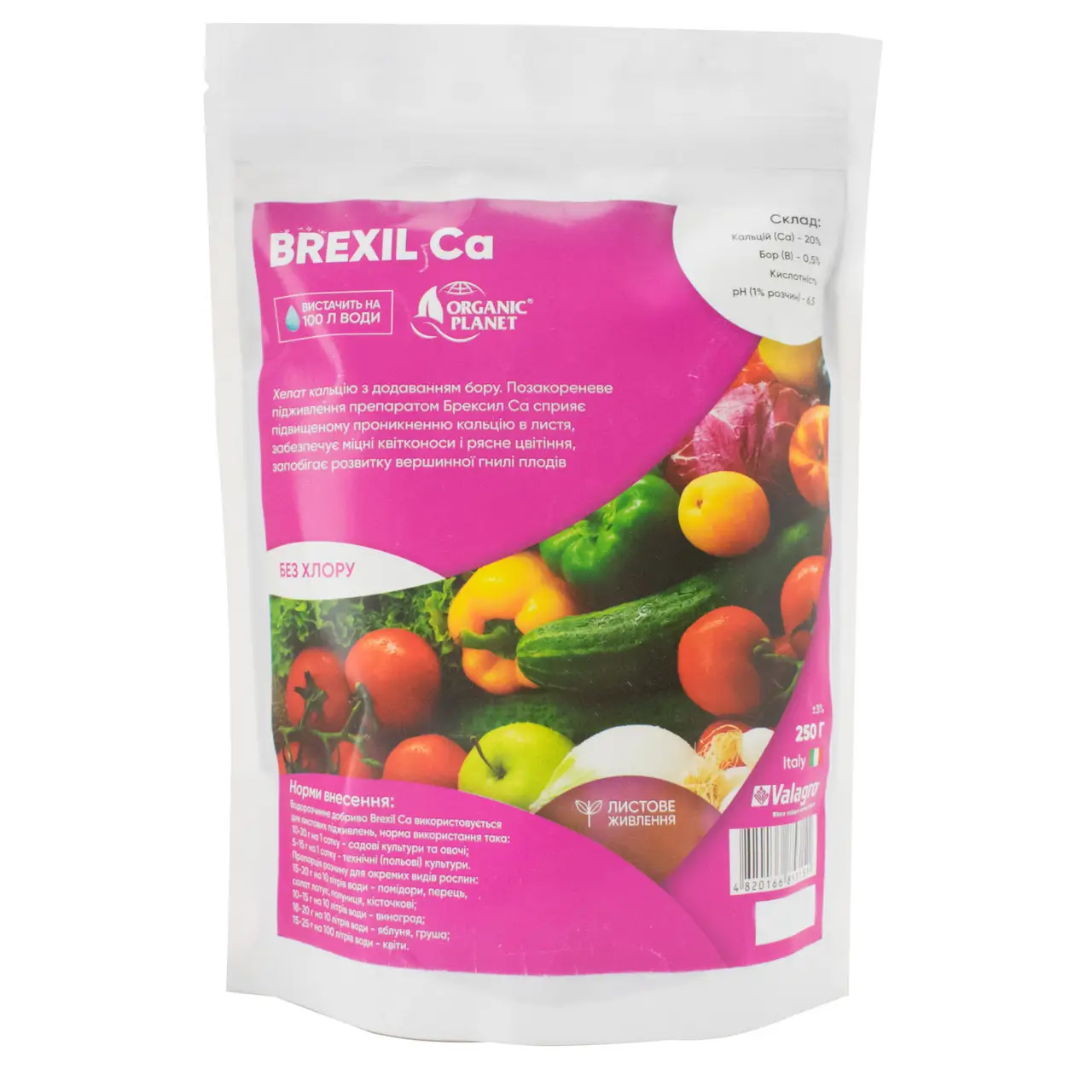 Брексіл Ca стабілізує обмінні процеси в рослинах, а не фітотоксичний. Має значно кращу ефективність, ніж кальцієва селітра.