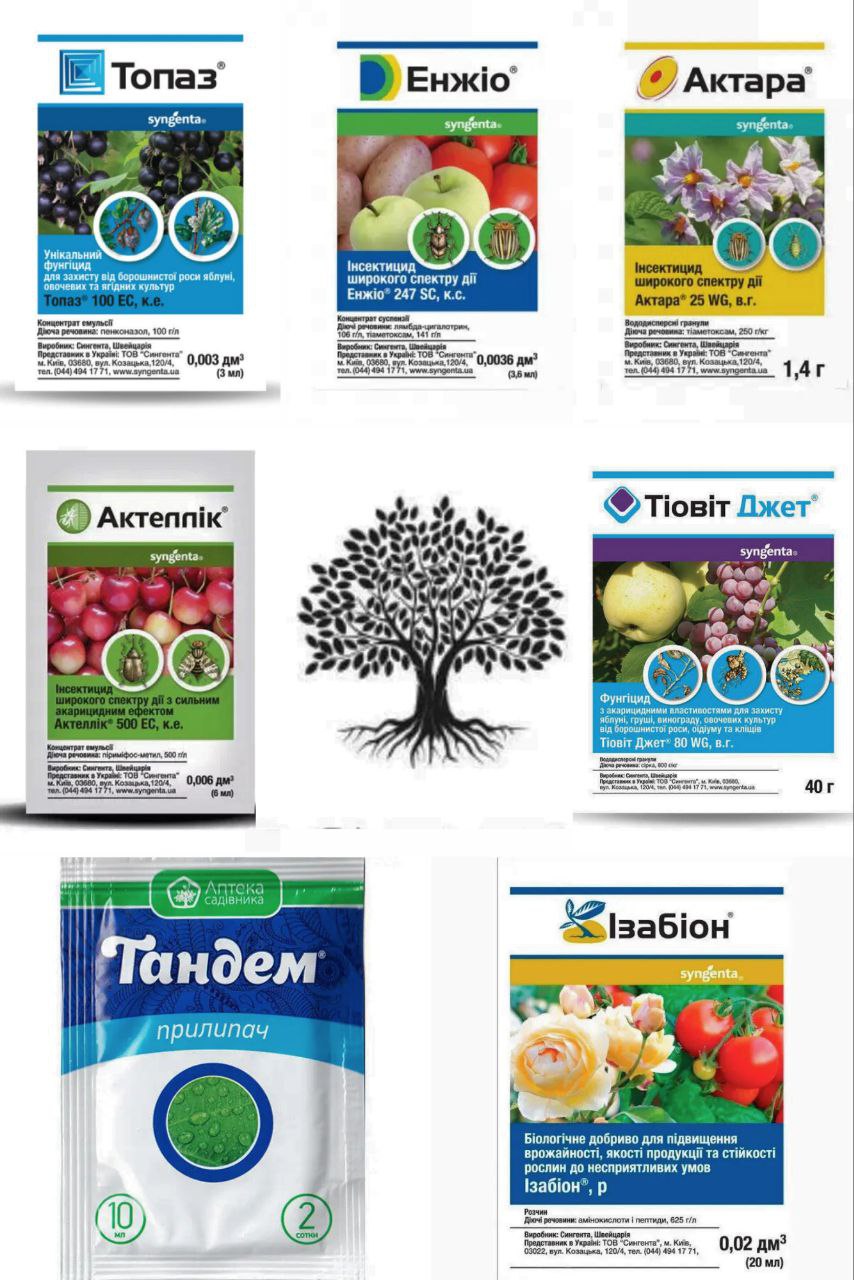Актеллік 500 ЕС 12 мл або Енжіо 247 SC 3,6 мл або Актара 25 WG 1,4 г на 10 л води Тіовіт Джет 80 WG 40 г на 10 л води Ізабіон 20 мл Тандем 10 мл